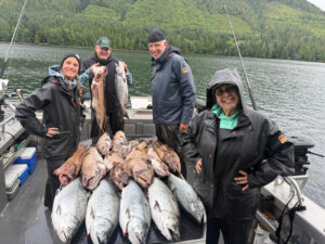 Day 2 brought lots of rain in Sandspit, but by the time we reached the west side of the island, it was intermittent and we stayed mostly dry. We headed north and concentrated on salmon. We caught enough kings to fulfill half our limit, several silvers, more lingcod, and a few rockfish. Most of the other boats did even better, absolutely slaying the salmon—with several big kings up to 30 pounds!
